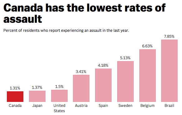 캐나다는 매년 세계에서 가장 살기 좋은 나라 순위권에 있으며 1위를 차지하기도 합니다. 또한 미국과는 달리 총기 사용 불법이기 때문에 총기 사고와 범죄율이 낮은 안전한 환경을 갖추고 있습니다. 소수의 행복이 아닌 전 국민의 행복을 최우선으로 생각하는 뛰어난 사회복지제도 역시 캐나다를 세계에서 가장 살기 좋은 나라로 만든 이유 하나입니다.