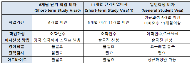 2011년 1월 10일 이후, 관광비자의 일종인 장기 학생 방문 비자(STSV, Short-Term Student Visa)가 신설되면서 영어점수 제출 없이 6개월 이상의 연수가 가능해졌습니다. 또한 PBS(Points-based System) 제도로 비자법이 변경되면서 불가능했던 2곳의 학교를 정해서 가는 어학연수도 갈 수 있게 되었습니다. 다만, 학생비자와 비교했을 때 비자 성격이나 준비서류가 확연히 다르기 때문에 장기 학생 방문 비자를 충분히 알고 연수를 계획하셔야 합니다.