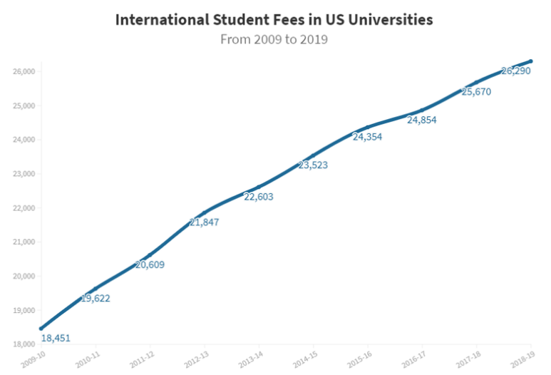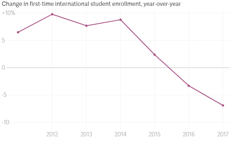 미국 원어민 학생들의 경우, 2018년 기준 연간 평균 270달러씩 증가했고 국제 학생들의 경우 보통 수수료가 두 배 정도 더 높으니 총 증가 폭이 상당히 큽니다. 이러한 급격한 상승이 국제학생들의 해외 유학에 영향을 미치고 있는데, 외국인 학생들의 폭발적인 수요가 거의 끝나가고 있다고 봐도 무방할 정도다. 미국 내 국제 교육 연구원에 따르면, 미국 내 대학교로 새로운 국제학생 등록이 2년 연속 감소를 보이기 시작했고 18년 기준 2017년 10만 9000명에 달하던 국제학생수는 전년보다 7000명 줄어 6%의 감소 폭을 보였다고 합니다.
