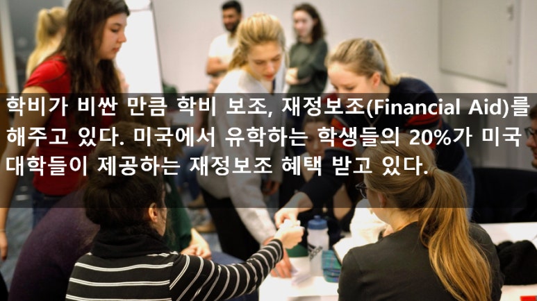 한국의 사교육에 지쳐 미국 유학을 알아보다 미국 대학 학비를 보고 지레 겁을 먹고 바로 체념하는 학부모들이 많다. 이렇게나 비싼 미국 대학교 학비를 내고 졸업 후 보상이 보장이 되지 않는 경우도 주변에서 많이 보게 되는 요즘은 더욱 그럴 것이다. 그렇다고 무조건 미국 유학에 등을 돌릴 필요는 없다. 미국은 특히나 사립대학의 학비가 비싼 만큼 학비 보조, 다른 말로 재정보조(Financial Aid)를 해주고 있다. 가정이 어려운 학생들에게 적게는 2만 달러 많게는 6~7만 달러까지 재정 보증을 해주는데 6만 달러라 하면 미국 사립대학교 연간 등록금에 생활비까지도 커버할 수 있는 금액이다. 실제로 미국에서 유학하는 학생들의 20%가 미국 대학들이 제공하는 재정보조 혜택을 누리고 있다.